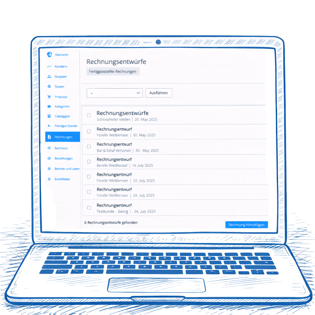 Die Abrechnung erfolgt automatisch auf Basis der Bestellungen. Rechnungen werden korrekt erstellt und können direkt versendet oder gesammelt exportiert werden.